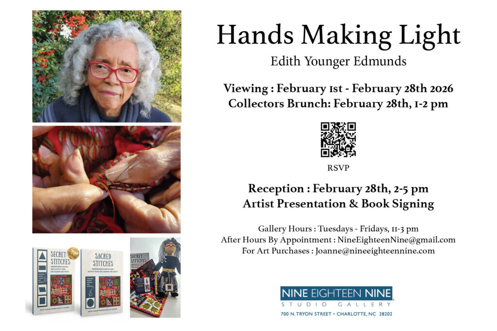 Nine Eighteen Nine Studio Gallery proudly presents HANDS MAKING LIGHT, a month-long exhibition celebrating the life, legacy, and luminous artistry of textile artist Edith Younger Edmunds at age 100. On view throughout the month of February, the exhibition is curated by Charlotte’s visionary arts advocate Joanne Rogers and mixed-media artist Cheryl Edmunds, co-curator.